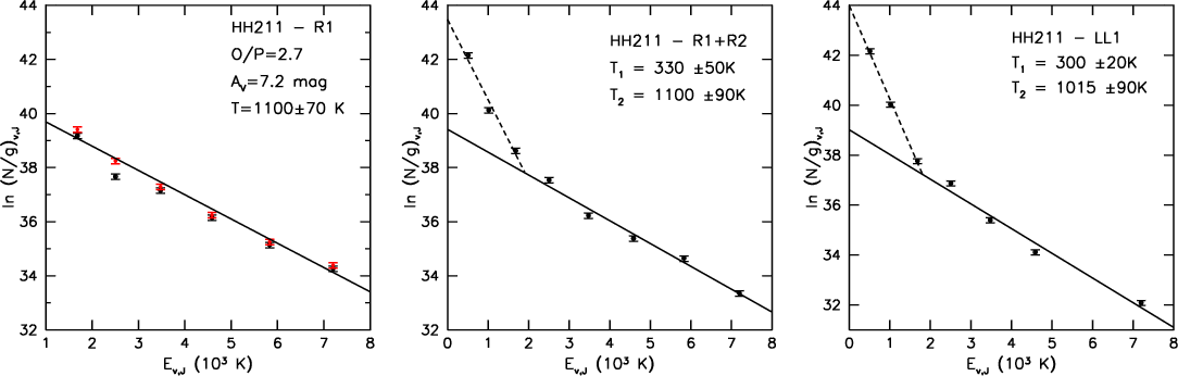 Continuum-subtracted spectrum, integrated over a region of 612 square arcseconds covering the HH211 flow ( middle),