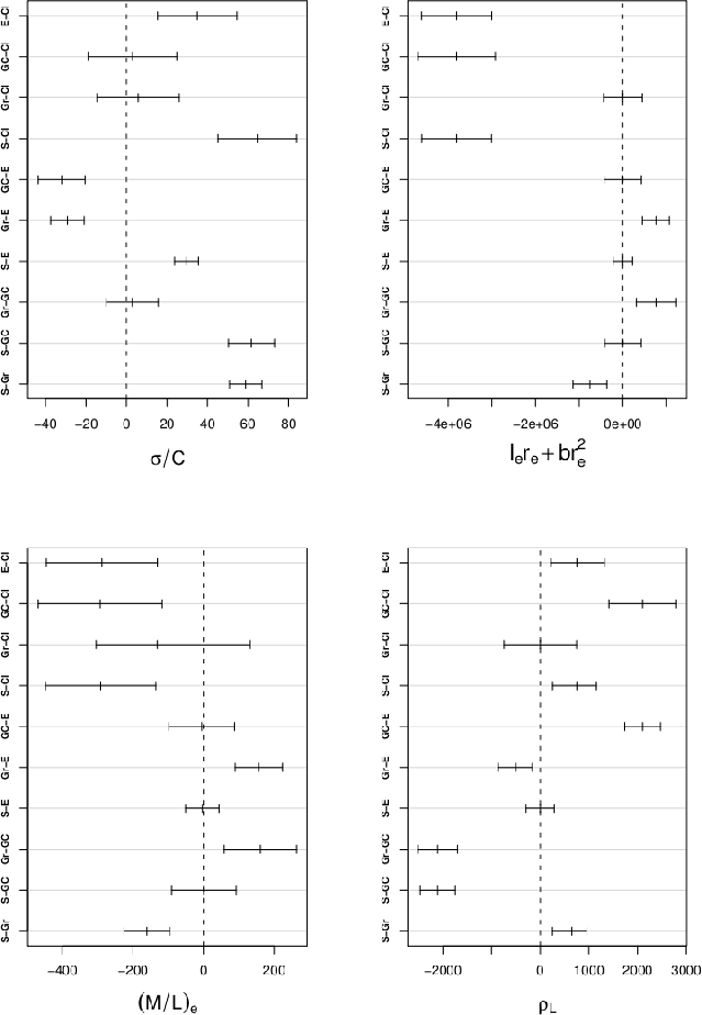 The idea of the fundamental plane (FP) has its origin in some restricted relations between global observables (central velocity dispersion, effective radius, and mean effective surface brightness) in stellar systems that emerge after statistical analysis of extensive photometric and spectral data accumulated for a number of objects over the past two decades (Dressler et al. 1987; Djorgovski & Davis 1987; Bernardi et al. 2003; Djorgovski & de Carvalho 1990). The FP is a bivariate family of correlations that are well established for elliptical galaxies in the optical and infrared ranges (e.g. Pahre et al. 1995; Guzman et al. 1993, respectively). Other FP-like relations are observed for spiral and dwarf galaxies (e.g. Jablonka et al. 1996; Cody et al. 2009) and galaxy clusters (Araya-Melo et al. 2009; Fritsch & Buchert 1999; Schaeffer et al. 1993; Lanzoni et al. 2004). Indeed, Burstein et al. (1997) propose the term ``cosmic metaplane'' to describe this ensemble of FPs from globular to galactic cluster scale.