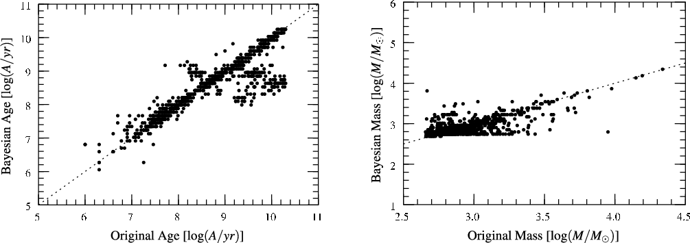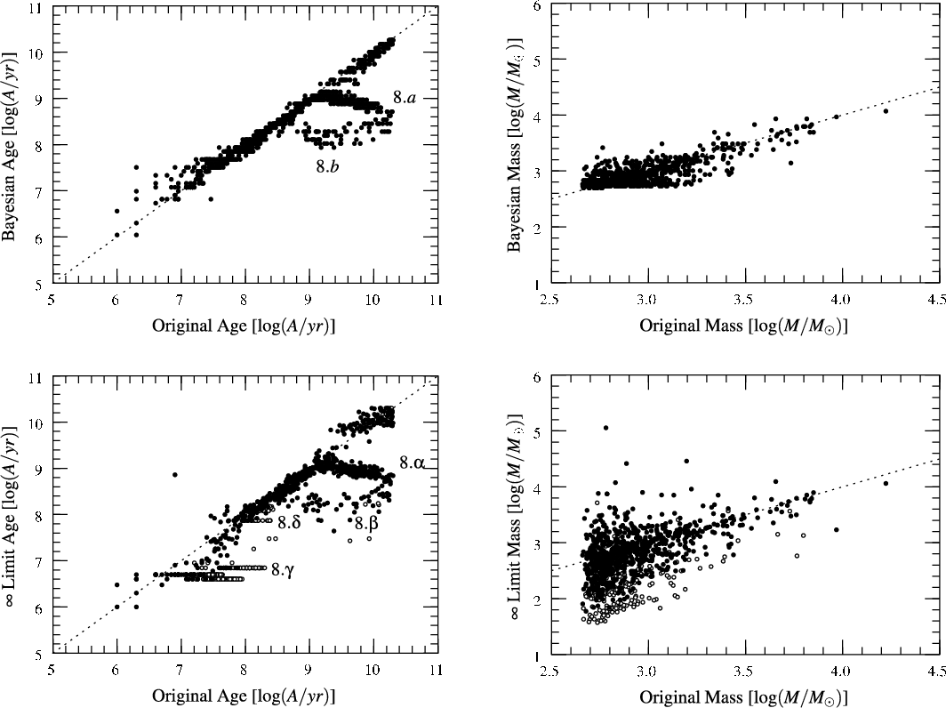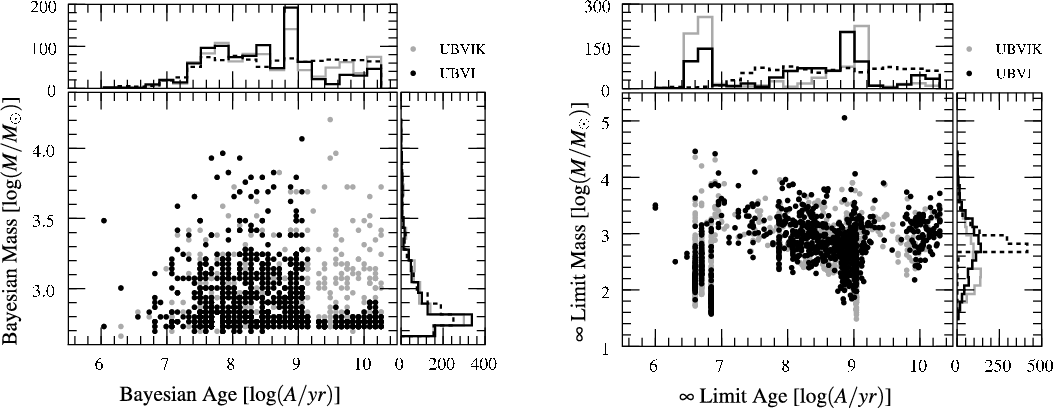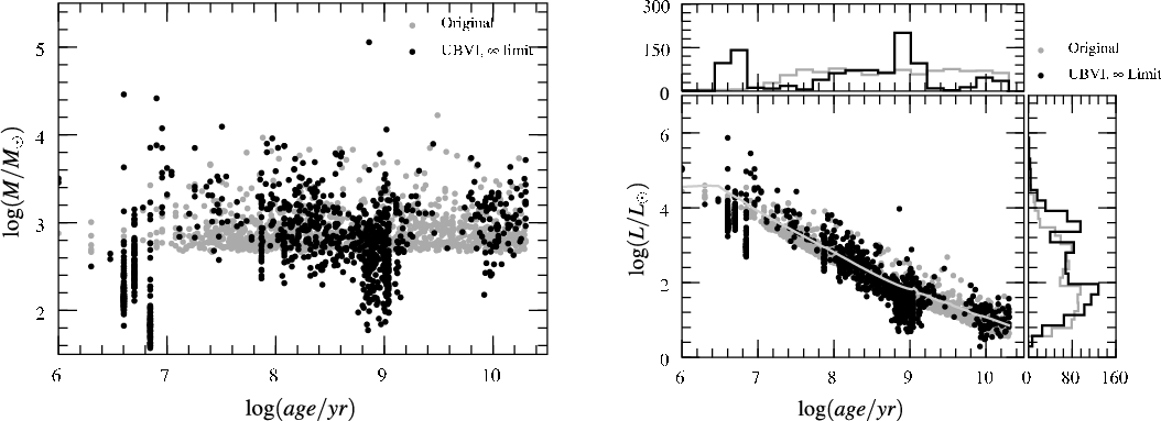 and masses over ages ranging between 20 Myr and 1.5 Gyr, with