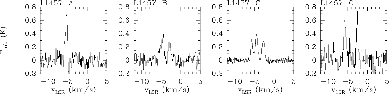 Figure 2: CS spectra towards the L 1457-A, L 1457-B, and L 1457-C, as obtained with the IRAM 30 m telescope. For L 1457-A and B, we only obtained single spectra towards the center of the cores. For L 1457-C we obtained a large map with 50 individual positions, which we averaged. The rightmost spectrum shows a single CS spectrum towards the position of J025616+192703. |