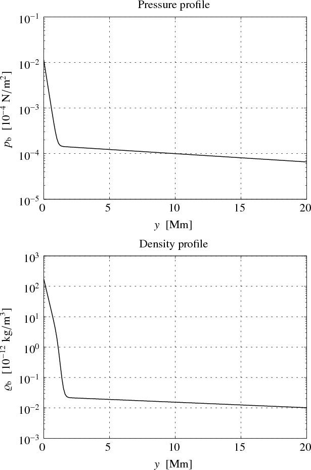 Figure 1: Vertical profiles of a background gas pressure (top panel) and a background mass density (bottom). |