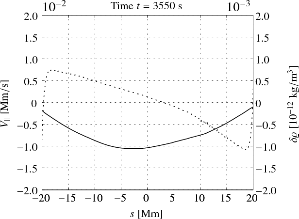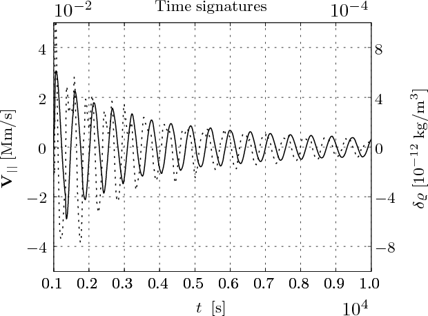 Time-signatures of a parallel velocity V|| (solid line) and perturbed mass density (dashed line),
