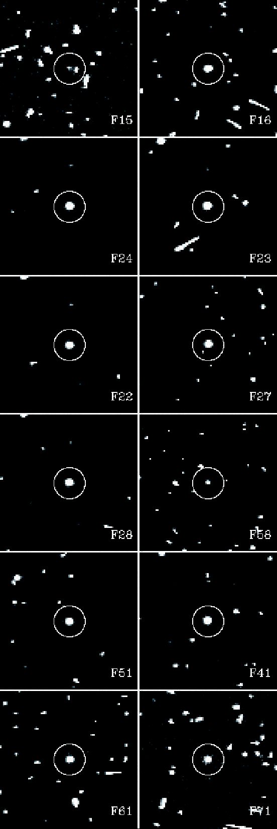 Figure 2: Enlarged subframe images of asteroid 21 Lutetia obtained with the 12 OSIRIS-NAC filters. Each one is centered on Lutetia highlighted by a circle. Note the excellent tracking by the spacecraft. |