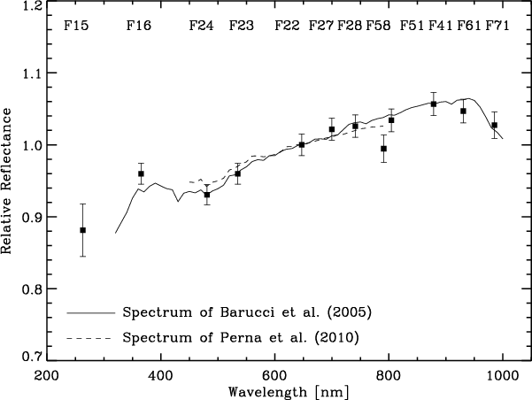 - Barucci, M. A., Fulchignoni, M., Fornasier, S., et al. 2005, A&A, 430, 313 [NASA ADS] [CrossRef] [EDP Sciences] [Google Scholar]