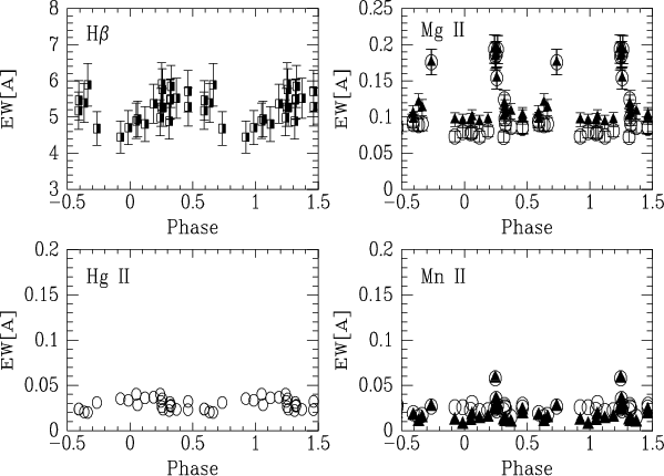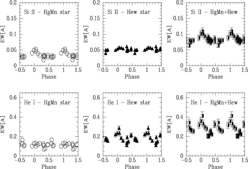 Among the upper-main-sequence chemically peculiar (CP) stars are the generally so-called Ap and Bp stars. These stars show slow rotation and abnormal abundance enhancements of some chemical species in their atmospheres as compared to ``normal'' A and B dwarfs of the same effective temperature (Jascheck & Jascheck 1987). According to their chemical peculiarity the stars are classified in the following subgroups (Preston 1974): CP1 (metallic line stars, earlier designation Am, with overabundance of metals), CP2 (overabundance of Si, Cr, and Sr-Cr-Eu, earlier known as Ap stars), CP3 (overabundance of Hg and/or Mn) and CP4 (He-weak, B-type objects with abnormally weak lines of He I). In addition, Preston (1974) clearly distinguished two main groups: a non-magnetic sequence of Am and Hg-Mn stars and a magnetic sequence of Ap and some He-weak stars. On the other hand, a large fraction of these stars are known to be binaries: the CP1 subgroup has 32.5% binaries and the CP2 group has 66% binaries with large magnetic fields (Seggewiss 1993), while more than 67.7% of the CP3 stars are members of binary systems (or of systems of higher multiplicity) (Hubrig & Mathys 1996,1995). Based on the information of 45 binary systems with known orbital periods, Gerbaldi et al. (1985) found a deficiency of binaries for the He-weak stars, Si stars, Si-Cr, and Si-Sr stars and also confirmed a predominance of double-lined binaries (SB2) among Hg-Mn stars and a total absence of SB2 systems among the Si ones. This study also revealed a great deficiency among low-eccentricity systems for all peculiar stars except for the Hg-Mn ones, which was confirmed by Leone & Catanzaro (1999).