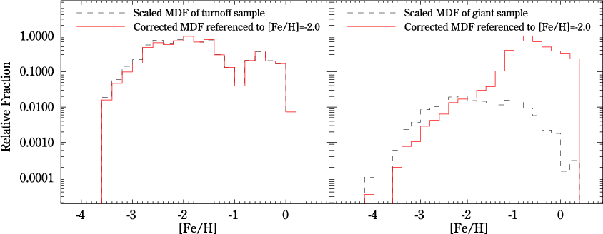 MDFs of the metal-poor turnoff and the halo giants notably differ in