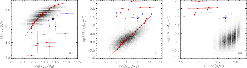 yr-1)], gas metallicity [12 + log (O/H)], and stellar mass [log (