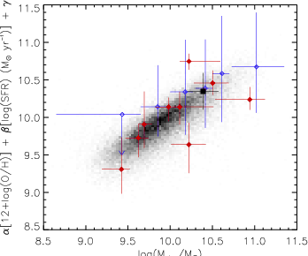 12 + log (O/H) and of 0.13 dex in log ( SFR). Blue empty diamonds represent the Erb et al. (2006) data at