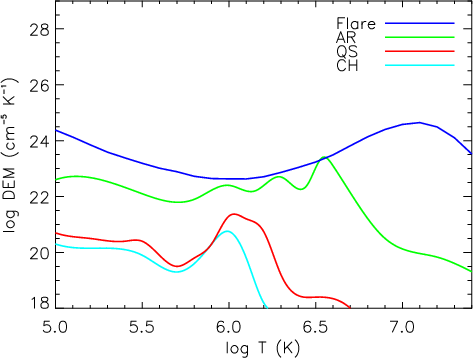 Included in Fig. 1 are sample DEMs for coronal hole (CH), quiet Sun (QS), active region (AR) and flare plasma. The CH DEM (Del Zanna 1999) and QS DEM (Andretta et al. 2003) were obtained from measurements by the Coronal Diagnostic Spectrometer (CDS; Harrison et al. 1995) on the Solar and Heliospheric Observatory. The AR DEM (O'Dwyer et al., in prep.) was obtained from AR intensities measured by the EUV Imaging Spectrometer (EIS; Culhane et al. 2007) on Hinode. The flare DEM was based on observations of an M2 X-ray class flare by Dere & Cook (1979).