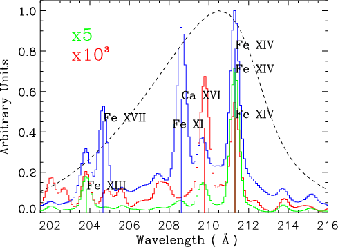 Figure 8: Same as Fig. 2 for the 335 Å channel, except that the AR synthetic spectrum (green) is included instead of the flare spectrum. |