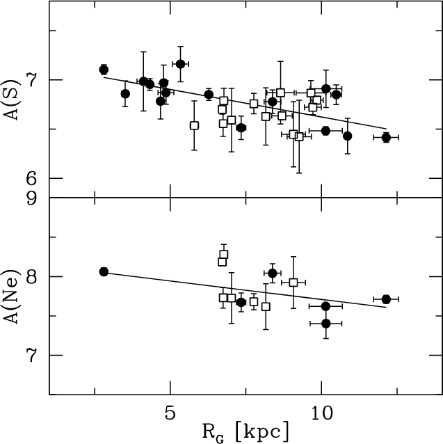 oxygen, neon, sulfur, and argon in PNe and H II regions, and determine their averages and radial gradients.