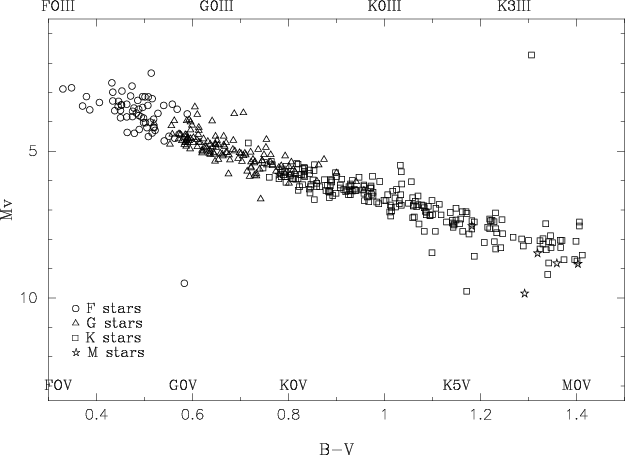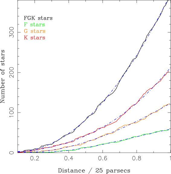 Our reference stellar sample consists of main-sequence (luminosity classes V/IV-V) FGK stars located at distances less than 25 pc. The stars have been selected from the the Hipparcos catalogue (ESA 1997), since it constitutes a homogeneous database especially for distance estimates - parallax errors are typically about 1 milliarcsec. In this work we have taken the revised parallaxes computed by van Leeuwen (2007) from Hipparcos' raw data. No other selection criteria have been applied to the sample.