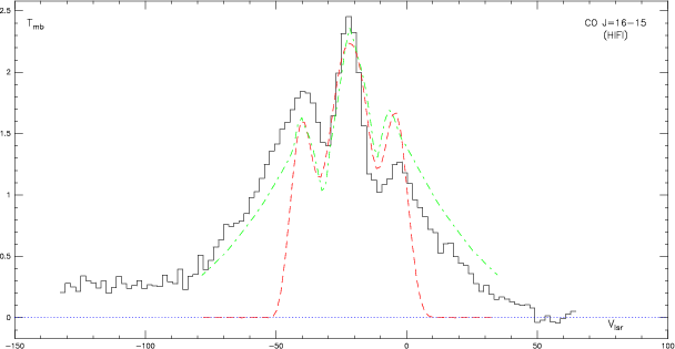 Figure 4: 12CO J = 16-15 observed line and predictions of our model (Sects. 3, 4), without (dashed, red line), and with (dot-dashed, green line) significant increase of the excitation in the very fast outflow. |