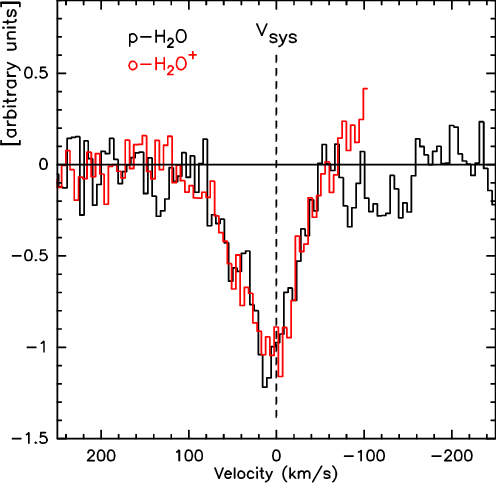 107.2 kms-1 from the p-H2O(111-000) and o-H2O+(111-000) absorption profiles. With the low-excitation temperature approximation,