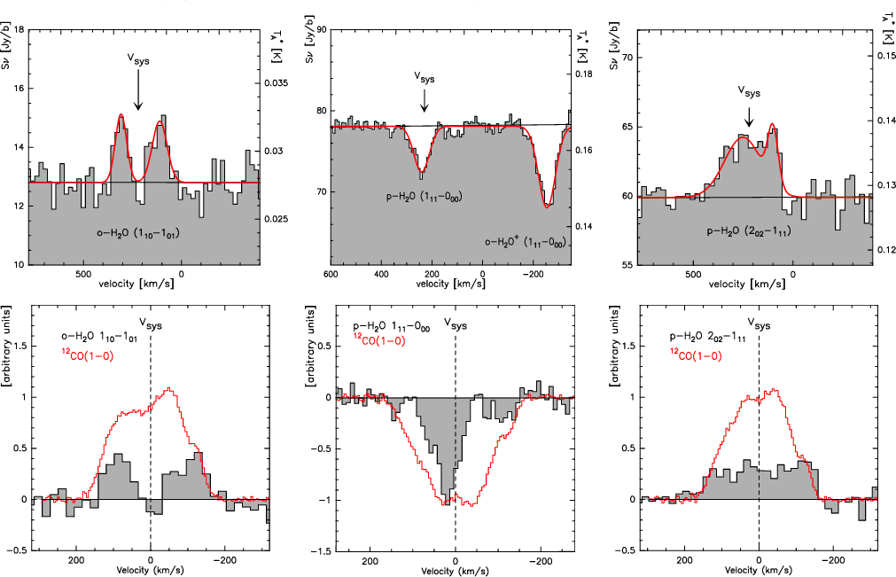 Top: spectra of the o-H2O(110-101), p-H2O(111-000) and p-H2O(202-111) lines