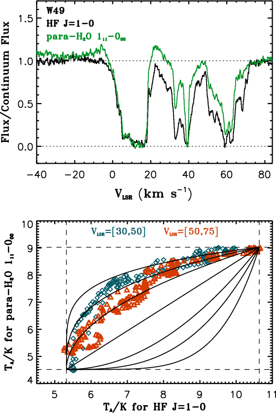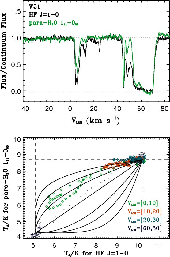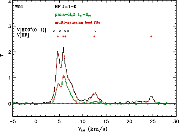 Toward W51, all para-water components in the LSR velocity range 0 to 30 km s-1 are optically thin, while those of HF are either optically thin (the 12 and 24 km s-1 components) or moderately thick (the 6 and the 45 km s-1 complexes), hence allowing us to directly measure the column density of these species for each set of clouds. This stands in contrast to G10.6-0.4, where the large HF J=1-0 optical depth allowed Neufeld et al. (2010) to obtain only a lower limit on the HF abundance. Note that the HF and para-water lines are optically thick in the velocity range 50 to 75 km s-1, thus only leading to lower limits on their column densities.