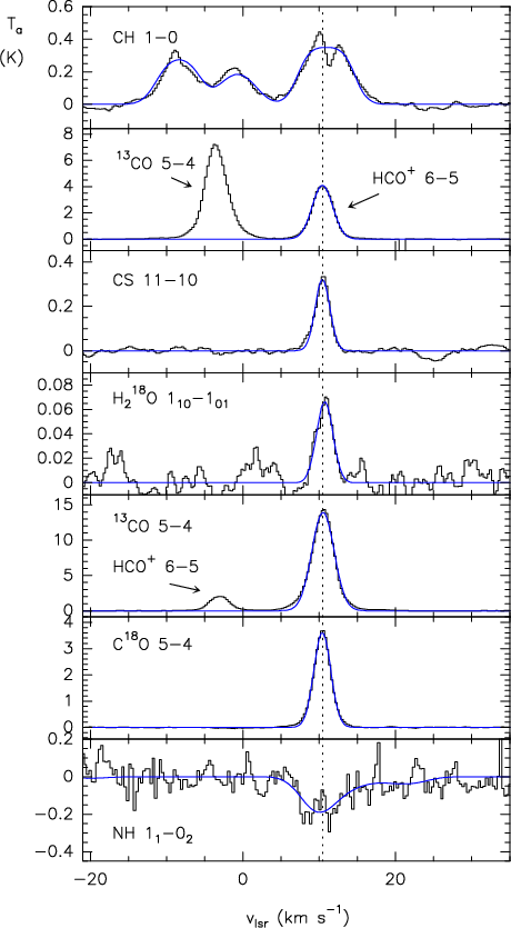 Results. The 13CO, C18O, o-H218O, HCO+ and CS observations are well described assuming that the emission is coming from a dense (