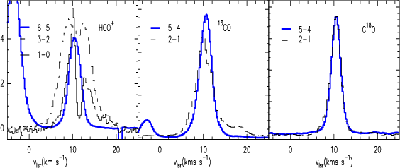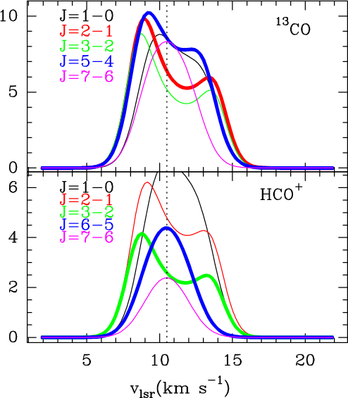 Figure 5: Predicted line profiles for the 13CO and HCO+ rotational lines using the model described in Sect. 4.2. |