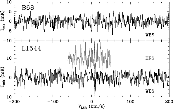 The prestellar core L1544 is more centrally concentrated than B68 and is undergoing gravitational collapse (e.g. Caselli et al. 2002b; van der Tak et al. 2005). The brighter FIR-continuum emission and the larger envelope (L1544 is embedded in the Taurus molecular cloud complex, whereas B68 is an isolated globule) most likely explains the observed absorption. The centrally concentrated and thermally supercritical starless cores, such as L1544 appear to be extremely good candidates for observations of water vapor in dark regions. Thanks to the high sensitivity and angular resolution of Herschel, these studies will provide a unique opportunity to finally shed light on the solid/vapor balance of water in molecular clouds and oxygen chemistry in the earliest stages of star formation.