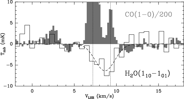 From the absorption, we have derived the first value of the o-H2O column density ever measured in dark and cold clouds, N(o-H2O) = (8