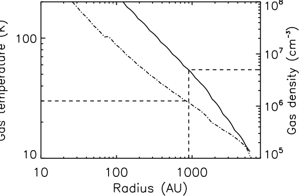 Figure 3: Density profile (solid line) and gas temperature profile (dot-dashed) of the IRAS 16293 envelope, as computed by Crimier et al. (2010). Values at a radial distance of about 900 AU are also indicated (see text). A distance of 120 pc was used in this computation (Loinard et al. 2008). |