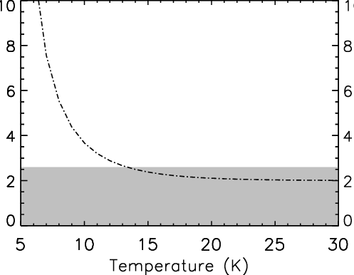 Figure 4: Upper limit to the measured D2O OPR (2.6, see text) as a grey box and the Boltzmann value (dotted-dashed line) as a function of temperature. |