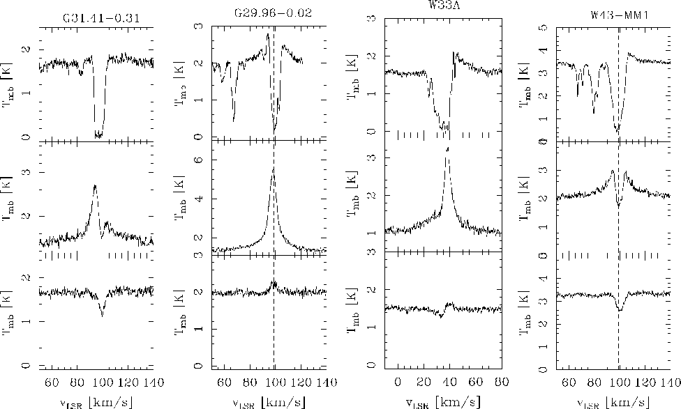 are derived for G31.41 and W43-MM1, which show self-absorbed 202-111
