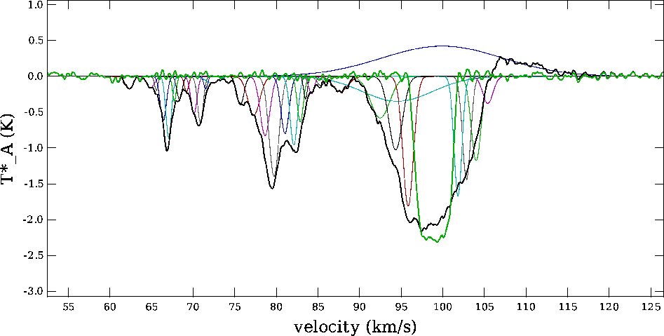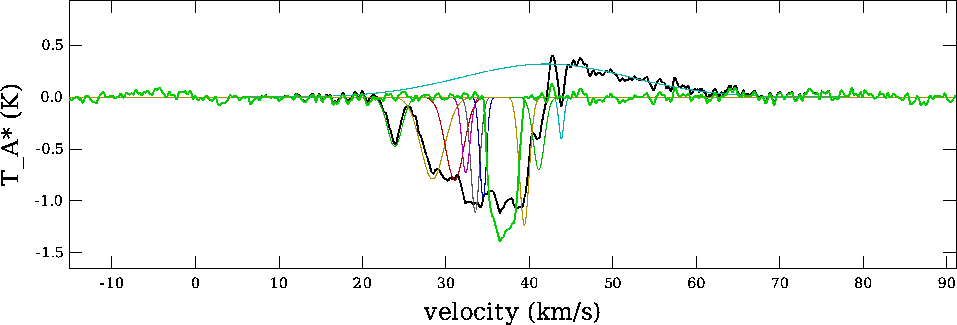 Figure A.2: Extraction of the saturated absorption of para-H2O 111-000 line in G29.96. Original profile appears in black bold, residual in green bold. |