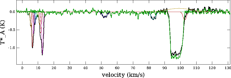 This appendix presents our procedure for removing these features in order to extract the contribution from the envelope to the line profile. In contrast to others, absorption from this part of the object is saturated. We are then able to remove other features by iterative Gaussian fits. This process is helped by the high resolution in velocity provided by the Herschel/HIFI instrument, showing accurate and ``bumpy'' profiles in absorptions. Assuming that each bump corresponds to a velocity component, they are removed using the Gaussian fitting tool available in the HIPE software. Starting from the component with the lowest velocity, they are extracted one by one, using the residual of the previous removal to fit the next one. This way of fitting insures a very good extraction of velocity component, giving a quasi-unique final decomposition of the absorption features. Results of this process are given in Figs. 2, A.1, A.2, A.3 and Tables A.1, A.2, A.3, and A.4.
