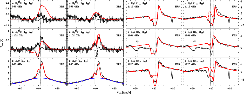 The observed lines were fit using the following strategy. First, we modeled the rare isotopologue lines and then the p-H2O 202-111 line (including the outflow emission) using the same