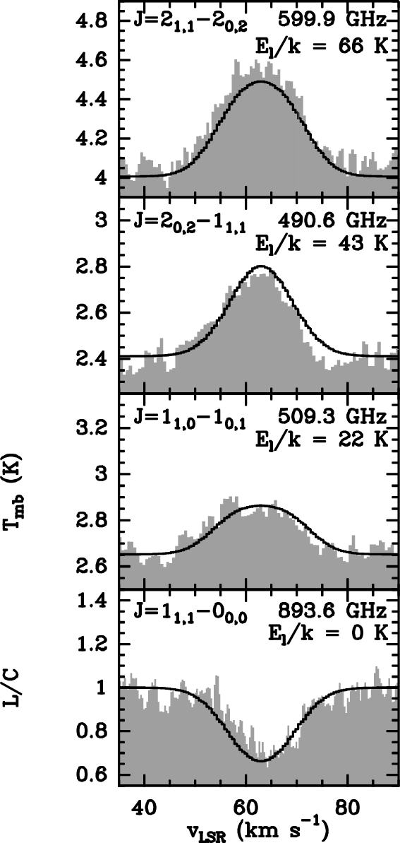 This was the goal of the study by Comito et al. (2003, hereafter C03), who investigated the ground-state HDO line at 893 GHz observed with the Caltech Submillimeter Observatory towards Sgr B2(M) and (N), as well as some published high-excitation HDO lines observed with the IRAM 30-m telescope (Jacq et al. 1990). The HDO observations were compared with those of the o-H218O ground-state line from SWAS (Neufeld et al. 2003), and of higher-energy p-H218O transitions observed with the IRAM 30-m by Gensheimer et al. (1996).