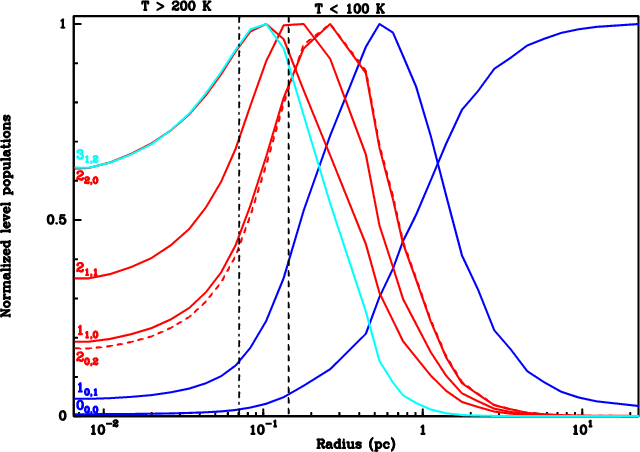 Figure 3: Normalized fractional level population computed by RATRAN, as a function of the distance from the center of the cloud, for the HDO transitions shown in red, dark blue and light blue in Fig. 1 (the population of level 20,2 is indicated by a dashed red curve, to avoid confusion with level 11,0). The levels are upper-energy, except for the ground-state 893-GHz absorption line, for which the relevant level population is that of the lower-energy level. |