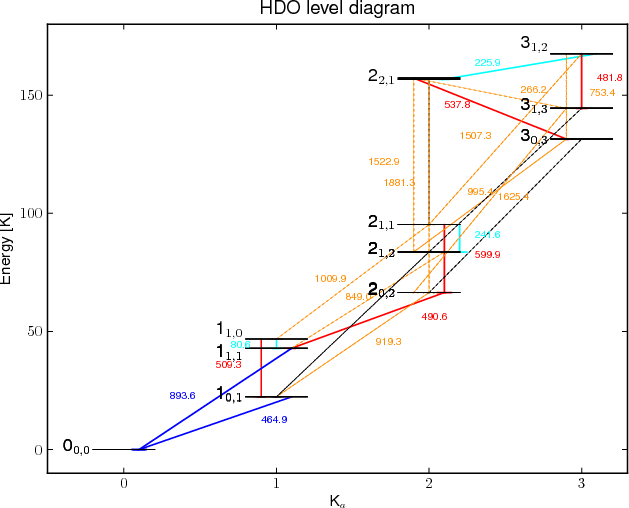 Figure 1: Level diagram of the HDO lines in the present dataset. The frequency of each transition is indicated in GHz. Transitions are color-coded as follows: in solid red, HIFI observations in band 1a and 1b (this work); in dashed orange, transitions falling within the overall HIFI range (to be observed within the HEXOS key program); in dark blue, submillimeter-wavelength observations (C03; M. Gerin, priv. comm.); in light blue, millimeter-wavelength observations from Jacq et al. (1990), Nummelin et al. (1998), and Belloche et al., in prep (cf. Belloche et al. 2008); in black, transitions that fall outside of the HIFI range. |