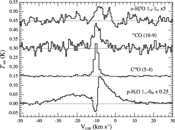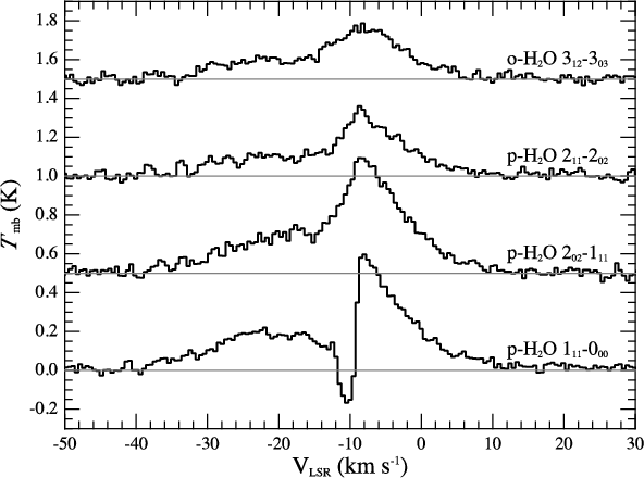 We thank the HIFI ICC for all of their help with the data reduction, and both the referee and journal editor for critical comments and speed of response. J.C. and A.F. give thanks to Spanish MCINN for funding support under program CONSOLIDER INGENIO 2010 ref: CSD2009-00038, and J.C., under programs AYA2006-14786 and AYA2009-07304. A portion of this research was performed at the Jet Propulsion Laboratory, California Institute of Technology, under contract with the National Aeronautics and Space Administration. This program is made possible thanks to the HIFI guaranteed time program. HIFI has been designed and built by a consortium of institutes and university departments from across Europe, Canada and the United States under the leadership of SRON Netherlands Institute for Space Research Groningen, The Netherlands and with major contributions from Germany, France, and the US. Consortium members are: Canada: CSA, U. Waterloo; France: CESR, LAB, LERMA, IRAM; Germany: KOSMA, MPIfR, MPS; Ireland: NUI Maynooth; Italy: ASI, IFSI-INAF, Osservatorio Astrofisico di Arcetri-INAF; Netherlands: SRON, TUD; Poland: CAMK, CBK; Spain: Observatorio Astronomico Nacional (IGN), Centro de Astrobiologia (CSIC-INT); Sweden: Chalmers University of Technology - MC2, RSS & GARD, Onsala Space Observatory, Swedish National Space Board, Stockholm University - Stockholm Observatory; Switzerland: ETH Zurich, FHNW; USA: Caltech, JPL, NHSC.