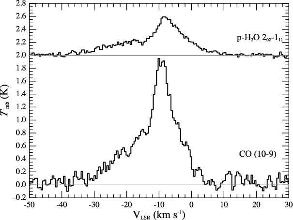 Figure A.1: The H2O 202-111 and CO 10-9 transitions; the main isotopologue of CO exhibits a profile similar to the main isotopologues of H2O. |