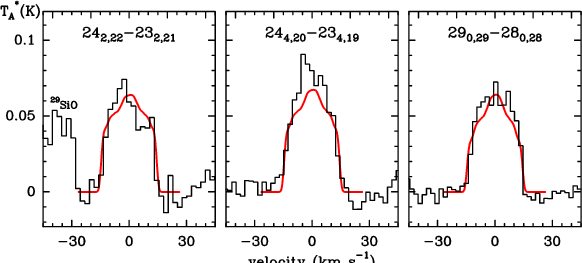 Figure 4: Comparison between the line profiles of three rotational transitions of SiC2 as observed with HIFI (black histograms) and as calculated with the radiative transfer model (red lines) using the abundance profile shown in red in Fig. 3. |