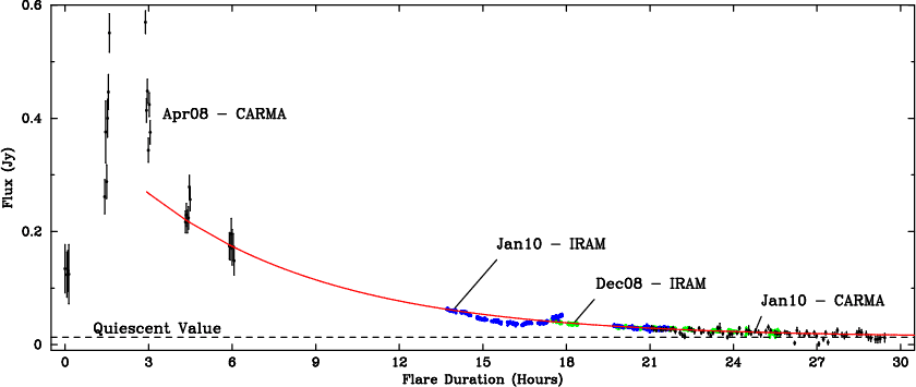 Pre-main-sequence (PMS) stars are characterized by variability in most wavebands. At millimeter wavelengths, however, the dominant emission process is the optically thin, thermal radiation from the dust located in a circumstellar disk. The integrated flux is therefore a measure of the total amount of cold circumstellar material, which evolves on timescales of roughly 106 years. Before the discovery of the first strong millimeter flare toward the young stellar object (YSO) GMR-A in Orion (Furuya et al. 2003; Bower et al. 2003), pronounced short-term millimeter variability was undocumented even though radio variability is well known toward YSOs (e.g. Stine et al. 1988; White et al. 1992). The lack of millimeter variability studies in the literature is in large part due to the time-consuming nature of observations at these wavelengths, leading to few follow-up measurements. As a result, DQ Tau is only the fourth YSO to be recognized in outburst at millimeter wavelengths. The initial serendipitous detection occurred during an 8-h observation on 2008 April 19, when the source brightened at 3 mm (115 GHz) in a matter of hours to reach a maximum detected flux of 468 mJy, in comparison to a quiescent value of 17 mJy in the adjacent days (Salter et al. 2008). The flare mechanism was attributed to synchrotron emission from a powerful magnetic reconnection event, probably due to the colliding magnetospheres of the binary components near periastron; and similar in nature to the interacting coronae evidenced toward another millimeter-flaring PMS star V773 Tau A (Massi et al. 2006,2002,2008).