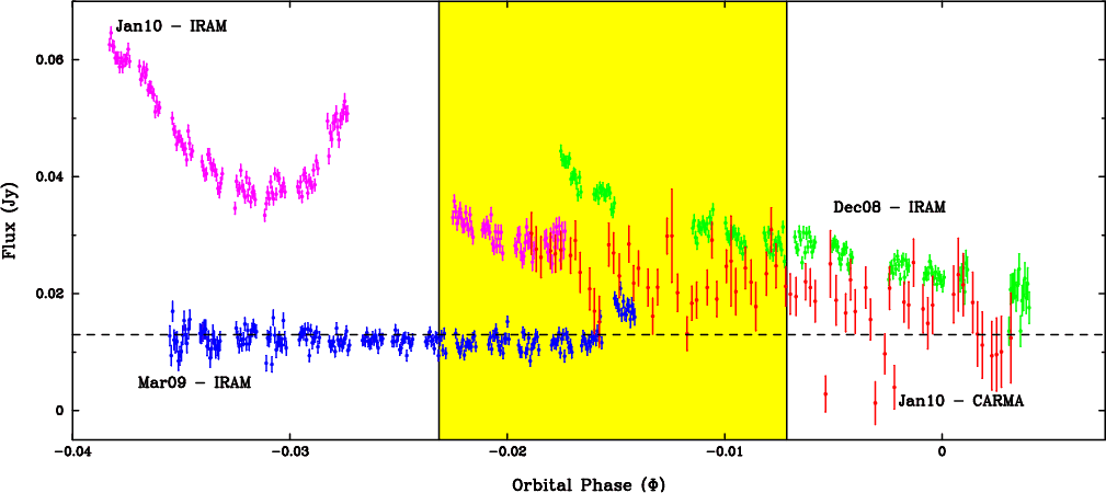 Table B.4: Julian day, flux, and uncertainty values for the millimeter light curve on 2010 January 11-12, recorded at a central frequency of 92.5 GHz with CARMA.