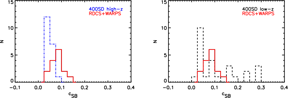 distributions of the two high-z samples, pointing towards a lack of concentrated clusters in the 400 SD high-z