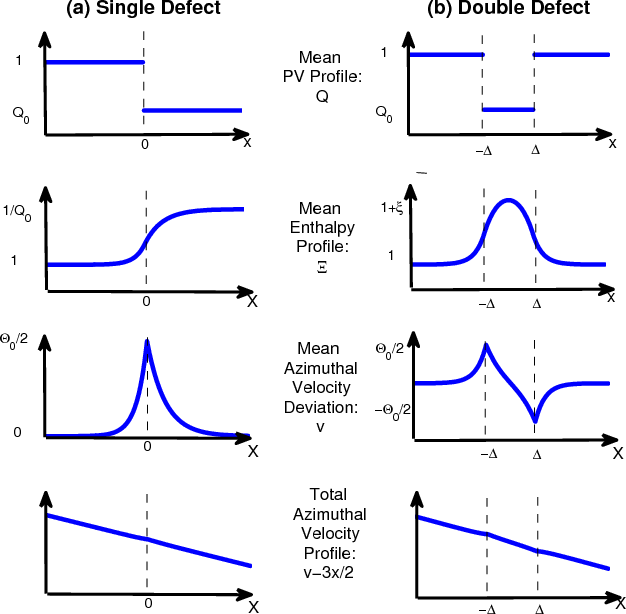 The importance of this perspective is that one may approximately assess whether or not a more complicated looking PV-profile can become unstable to the RWI instability by appealing to this conceptually simple mechanistic view. For example, if a more sophisticated PV-profile were treated as if it were a series of PV-steps, then an approximate prediction for the onset of instability would only require calculating edgewave speeds along each defect taken as though each were in isolation. Onset conditions would be predicted for values of the parameters in which any two of these wavespeeds are nearly equal.