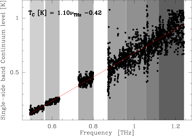 Figure A.1: Double sideband continuum (in antenna temperature scale) level towards IRAS 16293-2422, from 0.5 to 1.2 THz. The straight line is the result of a linear fit. The observed HIFI bands are highlighted. |