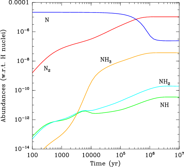 To model the steady-state abundances of the nitrogen hydrides, the osu.09.2008 network and rates were used. The osu.09.2008 network contains 13 elements, 449 species, and 4457 gas-phase reactions. We note that this version of the OSU database does not contain molecular anions or any depletion of gas-phase species. The network has been updated from a revision of the branching ratios and rate coefficients for the