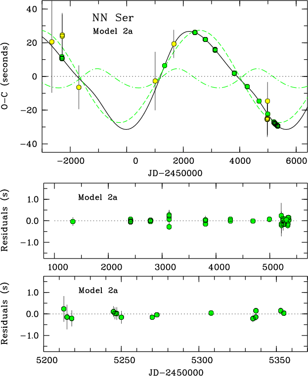 The large amplitude of the O-C eclipse time variations in NN Ser can only be explained by a third body in the system, while the still substantial residuals from a single-planet fit could, in principle, have a different origin from that of a fourth body. The two-planet model, however, possesses the beauty of simplicity, and the fact that the residuals for the entire data set vanish simultaneously imposes tight restrictions on any other mechanism. In particular, the lack of short-term variability of the residuals in the first half of 2010 argues against any process that acts on a short time scale or leads to erratic eclipse time variations. Hence, there is strong evidence for two planets orbiting NN Ser ab.
