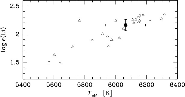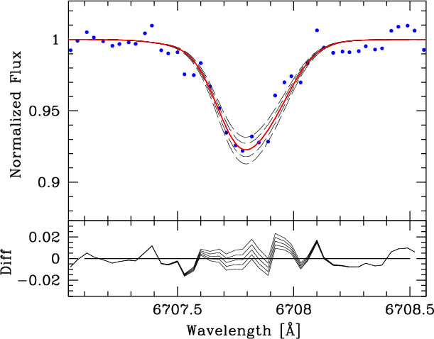 during observation). The Li abundance was determined through synthetic line profile fitting of the 7Li resonance doublet line at 670.8 nm. The results have been corrected for departures from LTE.