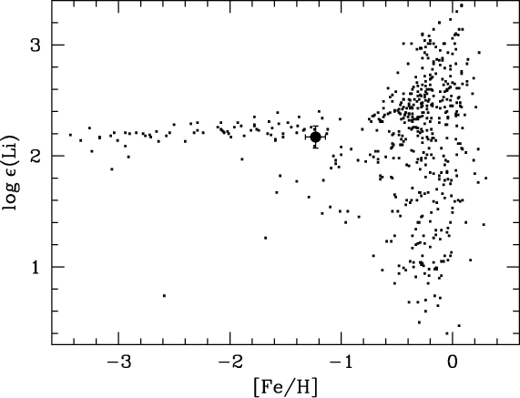 Since studies of Li are restricted to dwarf stars, the picture of the Galactic evolution of Li is incomplete and poorly understood. It is only for Galactic halo and disk stars in the solar neighbourhood for which Li has been unambiguously observed in dwarf stars. For instance, studies of metal-poor dwarf stars in the Galactic halo have revealed a cosmological Li problem: the measured Li abundance is a factor of 2-5 lower than predicted from standard Big Bang nucleosynthesis (BBNS) (e.g., Meléndez et al. 2010; Aoki et al. 2009; Asplund et al. 2006; Spite & Spite 1982; Bonifacio et al. 2007; Sbordone et al. 2010). The reasons for this are still unknown even though both non-standard stellar Li depletion (e.g., Korn et al. 2006) and non-standard BBNS (e.g., Jedamzik & Pospelov 2009) have been invoked. Studies of the Galactic disk show a wide scatter of Li abundances, with many stars indicating that Li increases to very high levels, as well as decreasing to very low levels (e.g., Lambert & Reddy 2004).