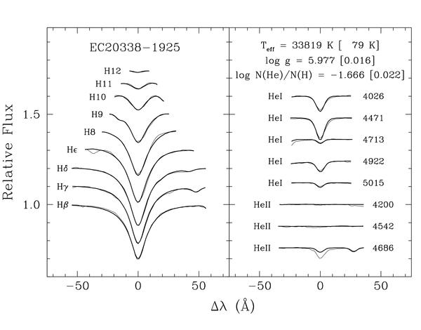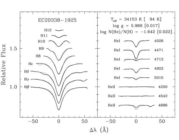 Left panel: available H and He lines from the combined FORS2 spectrum of EC 20338−1925 (thin lines), overplotted with the best atmosphere fit not including metals (thick lines). The atmospheric parameters derived are indicated in the plot. There are signs of interstellar absorption as revealed by the Ca II K feature in the blue wing of Hε. Right panel: the same as the left panel, except that here metals are included in the proportions listed in the text.