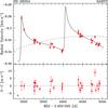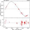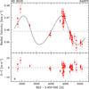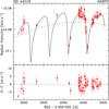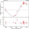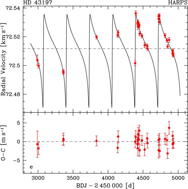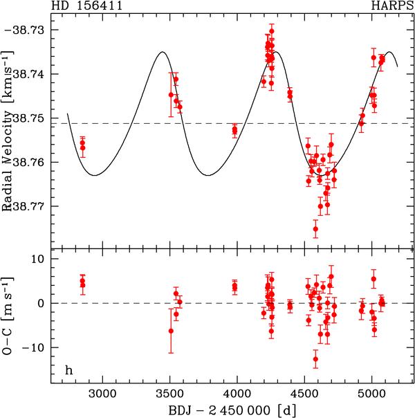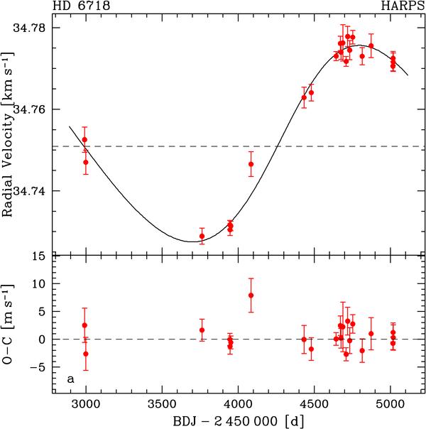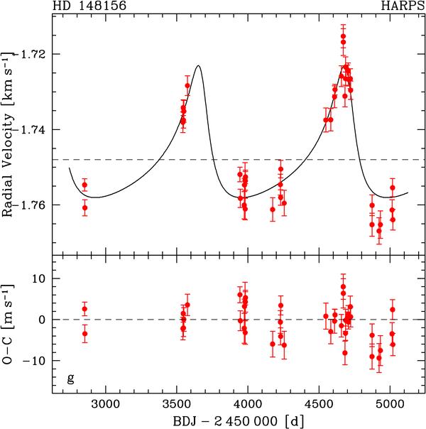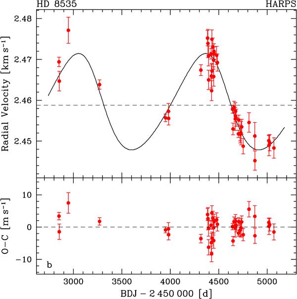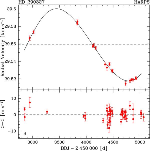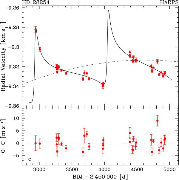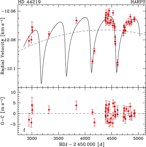 HARPS radial-velocity data for the eight stars presented in this paper. Temporal velocities (filled dots) and fitted orbital solutions (solid lines) are displayed in the upper panels. Residuals to the fitted orbits are displayed in the bottom panels. For HD 28254 and HD 44219, the dashed lines in the upper panels show additional quadratic radial-velocity drifts that were included to the orbital fits. For all the other targets, the upper panels dashed lines represent the systemic velocity γ.