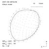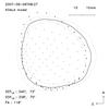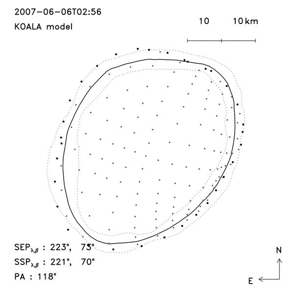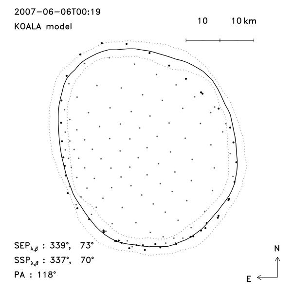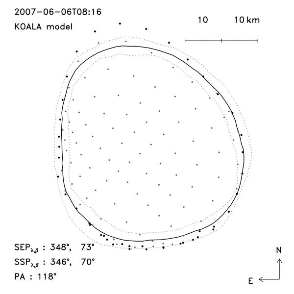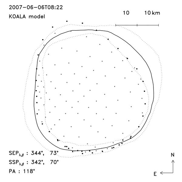 Comparison of the KOALA shape model of (21) Lutetia to the contours extracted on the adaptive-optics images. Each vertex of the shape model is represented by a gray dot, with the exception of limb/terminator vertices, which are drawn as black dots. The median AO-contour for each epoch is plotted as a solid gray line, and the 3σ deviation area is delimited by the dotted gray lines. We report the observing time (in UT), sub-Earth point (SEP), sub-solar point (SSP) coordinates and Pole Angle (PA: defined as the angle in the plane of the sky between celestial north and the projected asteroid spin-vector, measured counter-clockwise, from north through east) on each frame.