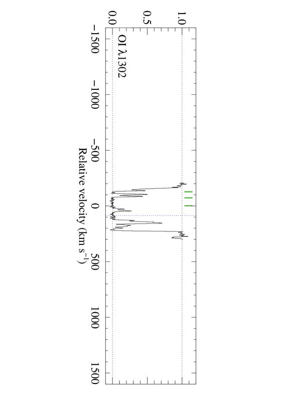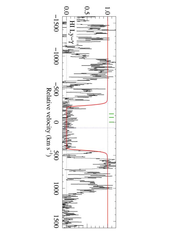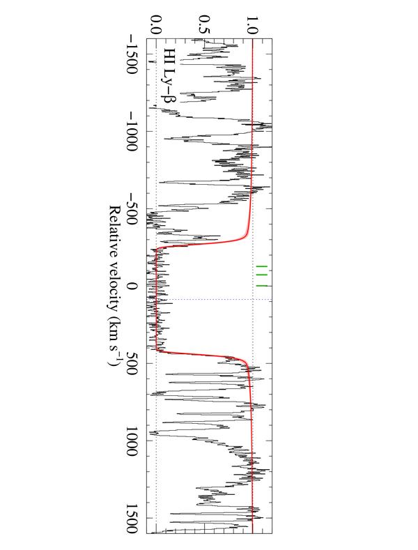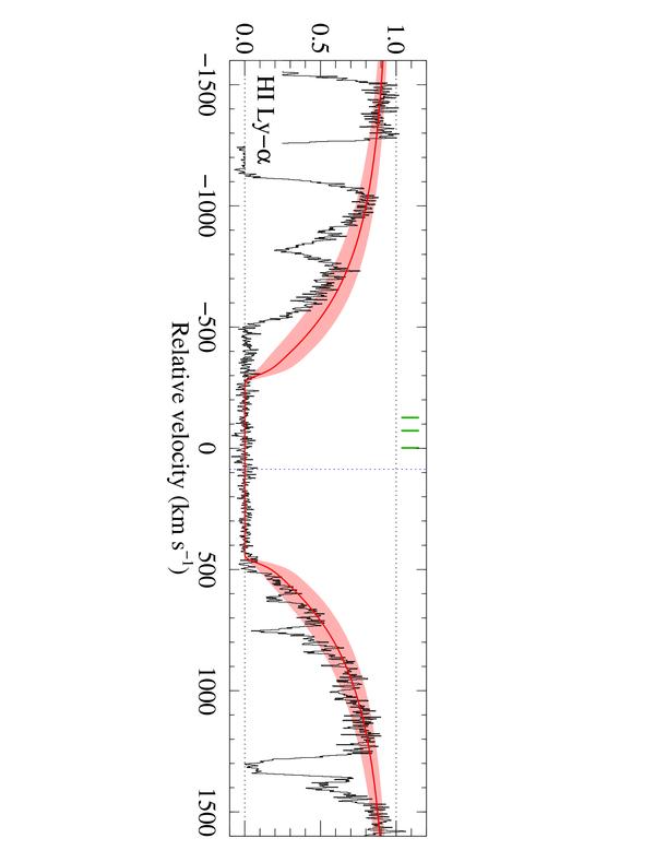 Measurement of the total column density of neutral atomic hydrogen at z = 2.69 towards J 1237 + 0647. The solid line represents the best one-component fit to the data. The centroid of the profile is indicated by a dotted vertical line. Uncertainties on the column density measurement are illustrated by the shaded area. The short tick marks indicate the position of the three H2-bearing components, the reddest of which also features CO and HD absorptions. The origin of the velocity scale for this figure and all following ones is defined at the position of the CO-bearing component at zabs = 2.68957.