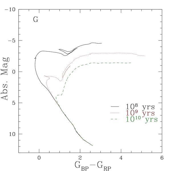 Isochrones computed at different ages, for G, GBP, and GRP using the luminosities of Marigo et al. (2008).